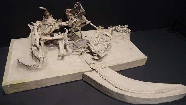 Seekor Velociraptor dan mangsanya, Protoceratops, menjadi fosil di tengah pertarungan. Raptor telah menusuk Protoceratops dengan cakar jari kakinya yang besar, tetapi Protoceratops berhasil menggigit dan mematahkan lengan raptor menggunakan paruhnya yang kuat. Keduanya lewat bersama, mungkin karena gundukan pasir yang tak terduga runtuh. (Foto: Yuya Tamai / Wikimedia Commons / CC BY 2.0)