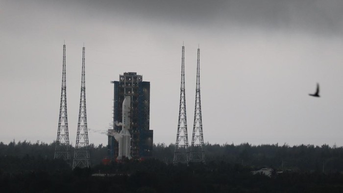 Di tengah guyuran hujan roket pembawa Long March 5 Yao-8, siap membawa Wahana Chang'e-6 menuju ke bulan di Wenchang Space Launch Site, Kota Wenchang, Provinsi Hainan, China, Rabu (3/5/2024).