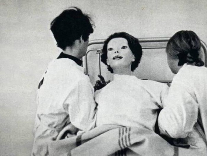 Ini adalah boneka lilin tanpa ekspresi yang diapit oleh dua siswa perawat dalam pelatihan medis. Foto ini dipotret fotografer Antony Armstrong-Jones pada tahun 1968 untuk bukunya Assignments. Pada saat itu, boneka untuk pelatihan medis wajahnya terbilang seram dibandingkan dengan zaman sekarang. Foto: Allthatinteresting