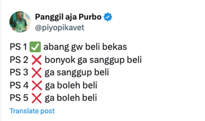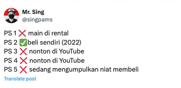 Jakarta - Ramai di X.com warganet yang menceritakan sejarah pembelian PS 1-5. Ada yang bisa beli gegara sunat hingga cuma bisa nonton di YouTube, kalau kamu?