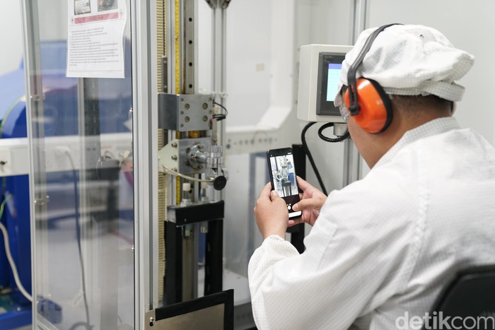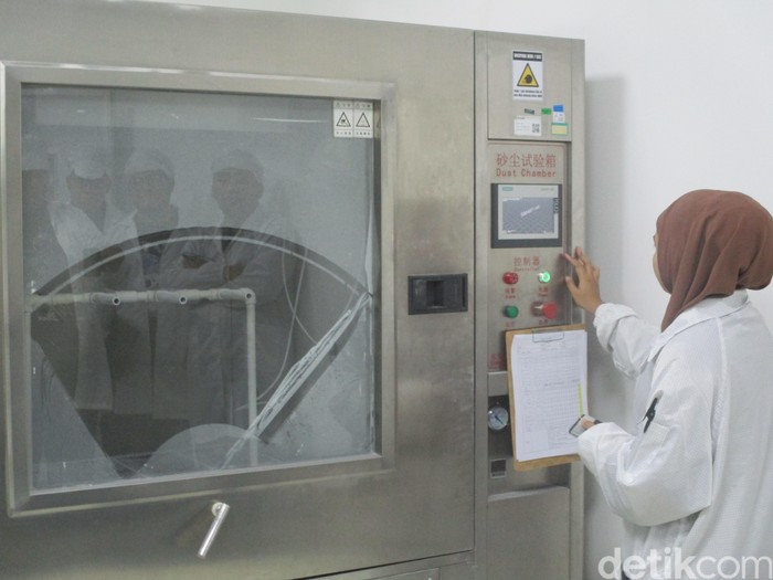 Rangkaian pengujian uji kontrol kualitas ini meliputi uji bantingan kecil, uji banting, uji rumble test, temperature shock, uji kamera, tes debu, dan yang terakhir adalah uji electrostatic discharge.Β Foto: Mohammad Frizki Pratama