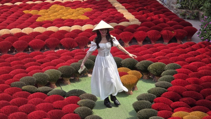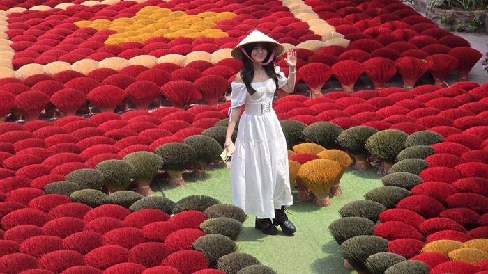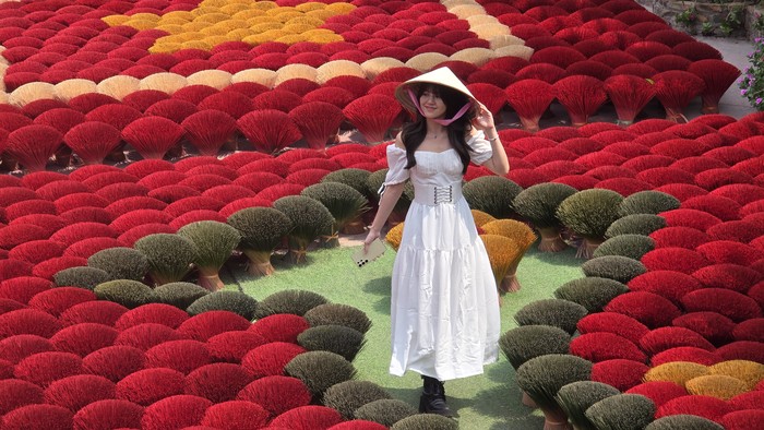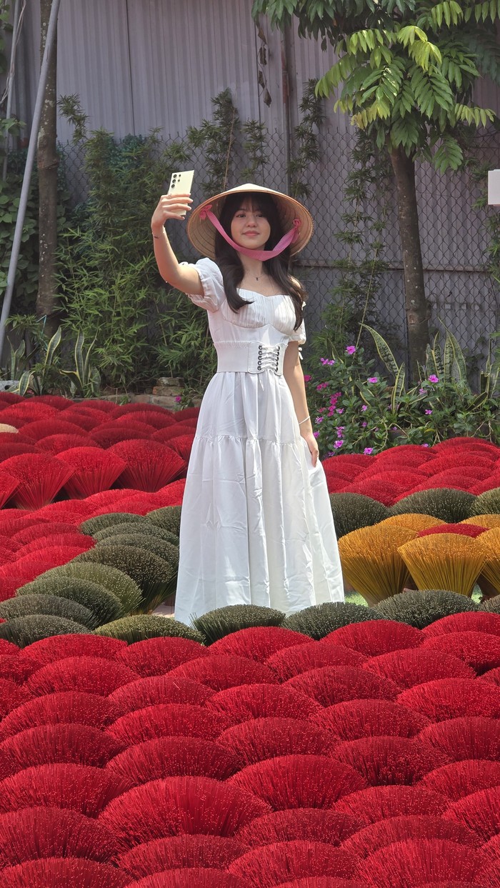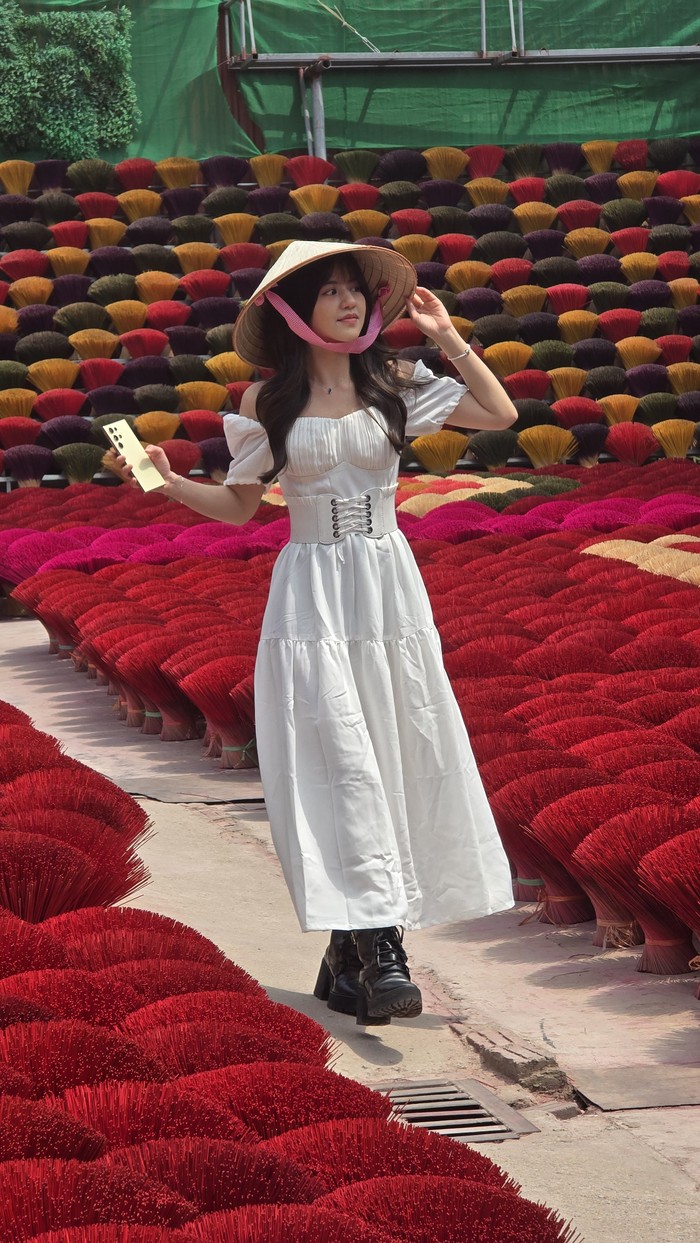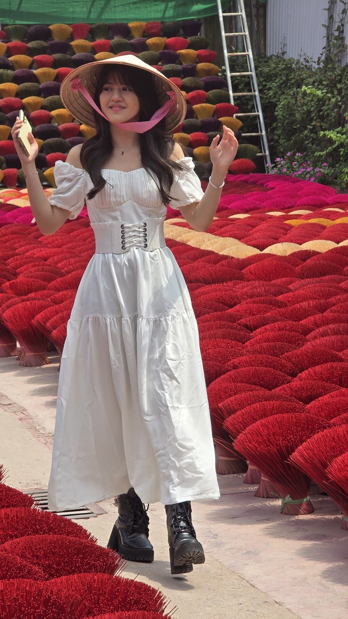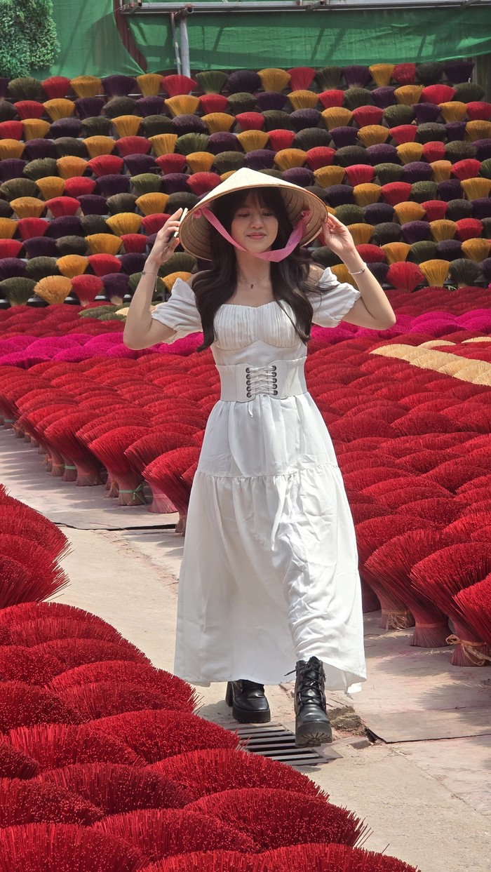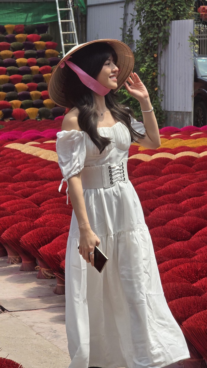 Di suatu kesempatan, detikINET berjumpa dengan Vonzy di Quang Phu Cau Incense Village. Dress putih yang dipakainya membuat dirinya tampil anggun. Foto: Aisyah/detikINET