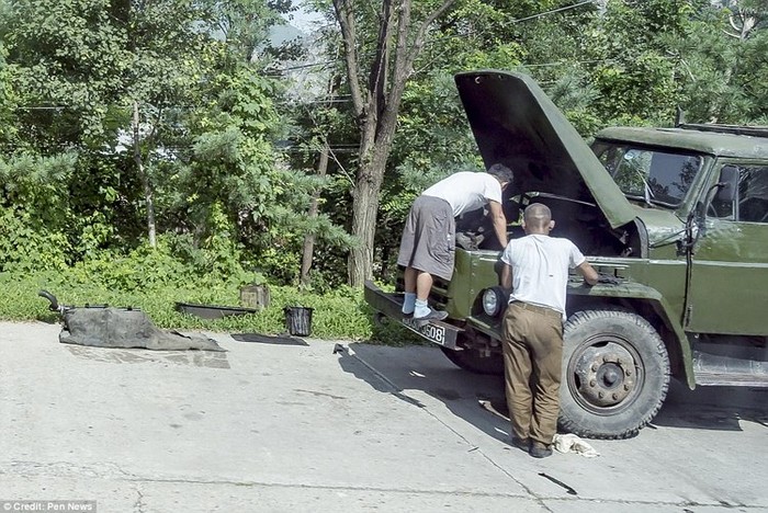 Tampak tentara Korut memperbaiki truk yang mogok. Foto: Pen News