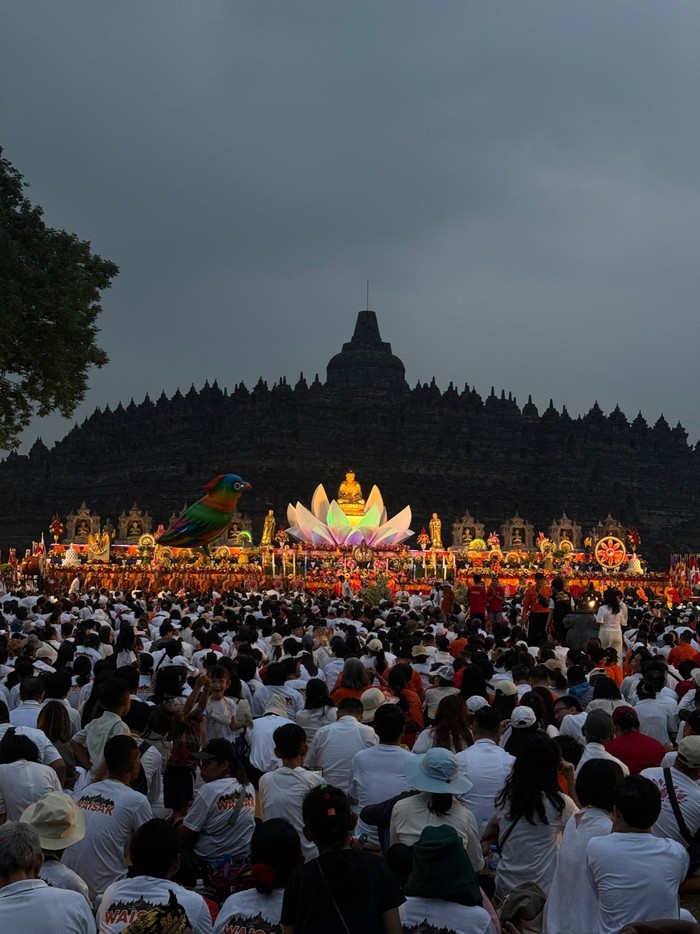 Keindahan perayaan Waisak Borobudur. Ulet berhasil mengabadikan karamaian pengunjung, perpadu dengan panggung utama, siluet candi dan langit petang. Foto: Ulet Ifansasti