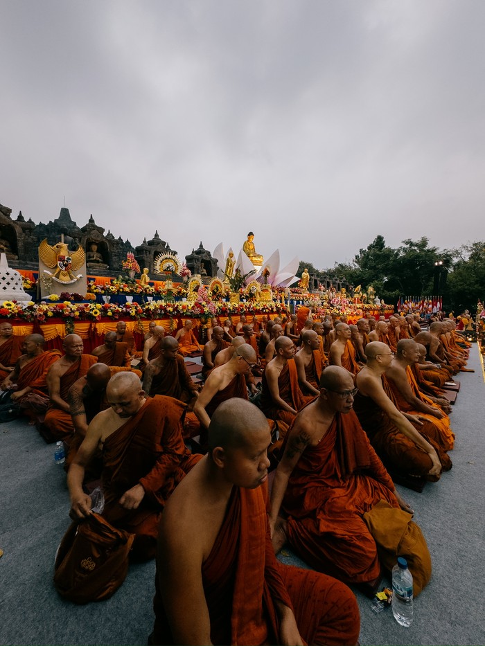 Menggunakan mode ultra-wide iPhone 15 Pro Max, Ulet mengabadikan para biksu dengan latar belakang candi dan patung Budha. Foto: Ulet Ifansasti