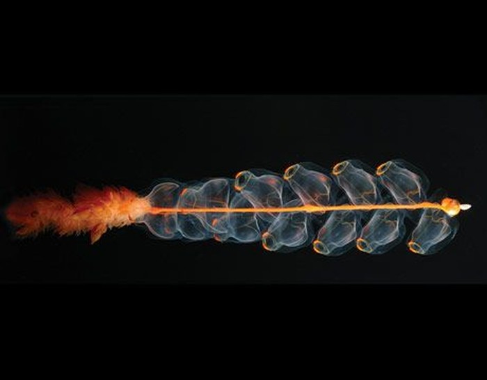Seperti roket bertingkat, makhluk mikroskopis yang aneh ini, Marrus orthocanna terdiri dari beberapa unit yang berulang, termasuk tentakel dan beberapa perut. Secara teknis, mereka adalah physonect siphonophores, yang terkait dengan manusia perang Portugis. Seperti semut, koloni yang terdiri dari banyak individu memiliki sifat-sifat yang menyerupai organisme tunggal. (Foto: popularmechanics)