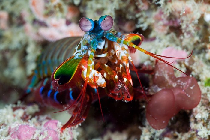 Udang Mantis Merak, spesies ini ditemukan di samudra Pasifik barat India dan Tropis. Hewan ini adalah jenis krustasea berwarna seperti permen yang dikenal dengan kemampuannya untuk 'meninju; mangsa dengan cepat dengan dua pelengkap depannya.