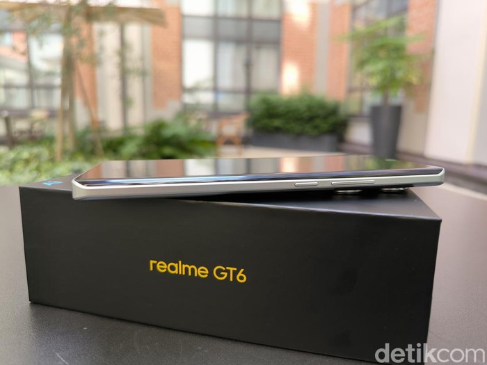 Unit Realme GT 6 dalam genggaman detikINET adalah varian berwarna perak. Kesan pertama yang muncul melihatnya adalah tampilan GT 6 yang tampak premium dan berkilau karena balutan casingnya yang glossy. Foto: Rachmatunnisa