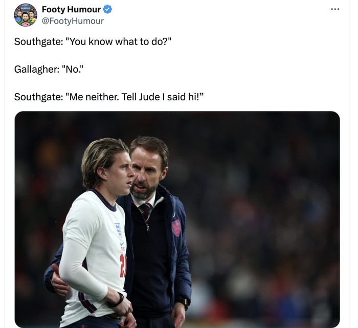 Southgate: Tahu apa yang harus kamu lakukan? Galagher menjawab tidak. Southgate: Aku juga tidak tahu. Salam saja buat Jude. Foto: X.com