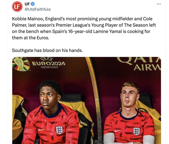 Southgate dituding menyia-nyiakan bakat muda yang luar biasa, Kobbie Mainoo dan Cole Palmer. Mereka hanya dicadangkan. Foto: X.com