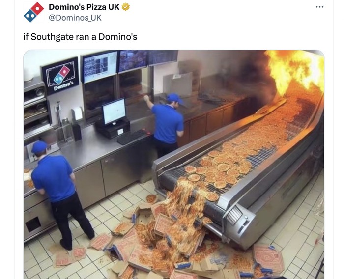Bahkan akun Domino Pizza juga menyindir Southgate bahwa dia akan mengacau kalau bekerja di sana. Foto: X.com