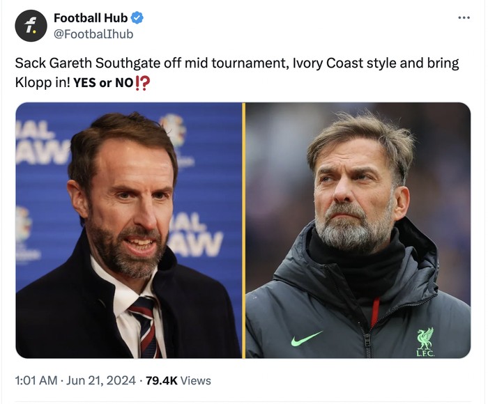 Bahkan sudah ada yang menyerukan agar Southgate dipecat dan digantikan Klopp. Foto: X.com