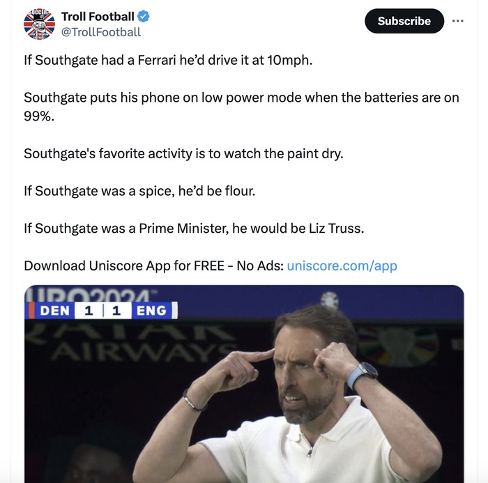 Taktik Souhgate yang membosankan disindir dalam cuitan ini. "Jika dia punya Ferrari, pasti kecepatannya pelan. Meski baterai HP-nya 99 persen, dia akan memasang mode rendah daya." Foto: X.com
