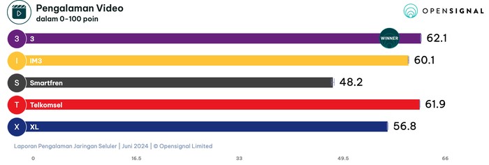 Operator 3 menjadi pemenang penghargaan Pengalaman Video, dengan skor 62,1 poin pada skala 100 poin. Indosat, Telkomsel, dan 3 semuanya berada di kategori Baik (58-68), sedangkan XL dan Smartfren menempati satu kategori di bawahnya, di Cukup (48-58). Peringkat Baik (58-68) berarti bahwa pengguna kami, rata-rata, dapat menyaksikan video pada resolusi 720p atau lebih dengan waktu pemuatan yang memuaskan dan sedikit penundaan. Foto: Opensignal Foto: Opensignal.