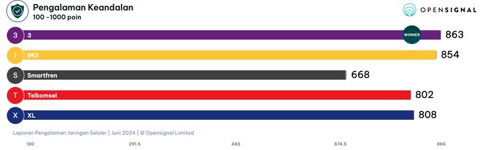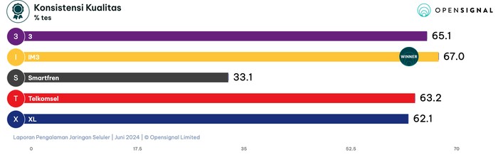 Skor Kualitas Konsisten untuk empat dari lima operator Indonesia telah meningkat sejak laporan sebelumnya, dengan 3 mengalami kenaikan poin terbesar sebesar empat persen. Smartfren adalah satu-satunya operator seluler di Indonesia yang skornya turun, poinnya turun beberapa persen. Foto: Opensignal