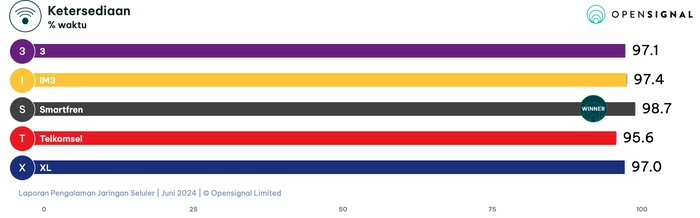 Smartfren mempertahankan satu-satunya kemenangannya di tabel penghargaan untuk penghargaan Ketersediaan, dengan skor 98,7%, yang mewakili proporsi waktu yang dihabiskan pengguna Opensignal dengan sinyal seluler 5G, 4G, atau 3G.Foto: Opensignal