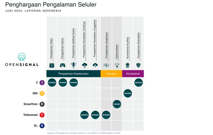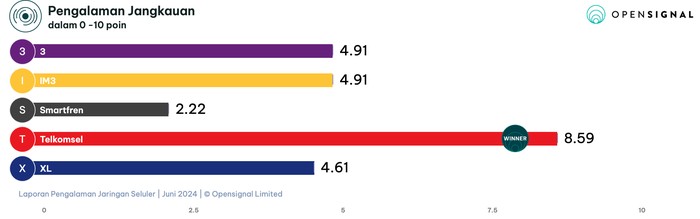 Telkomsel tetap menjadi satu-satunya pemenang penghargaan Pengalaman Cakupan dengan 8,59 poin pada skala 10 poin, memenangkannya untuk ketiga kalinya berturut-turut. Telkomsel memimpin jauh di atas Indosat dan 3 yang menempati posisi kedua dengan skor yang sama yaitu 4,91 poin. Foto: Opensignal