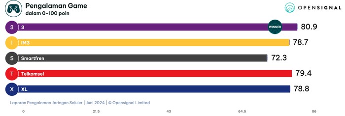 Tri merebut penghargaan Pengalaman Game dari pemenang tunggal sebelumnya yaitu XL dengan skor 80,9 poin pada skala 100 poin. Pengguna Indonesia kami menikmati pengalaman bermain game dalam yang Baik (75-85) secara keseluruhan di Indosat, XL, Telkomsel, dan Tri. Sedangkan Smartfren menempati satu kategori lebih rendah, yaitu Cukup (65-75). Foto: Opensignal