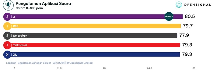 Ini berarti TriΒ Β adalah satu-satunya operator seluler di Indonesia yang mendapat peringkat Baik (80-87) untuk layanan aplikasi suara over-the-top β banyak pengguna puas, tetapi beberapa mengalami sedikit penurunan kualitas. Semua operator lainnya menempati kategori di bawah ini β Dapat diterima (74 -80). Foto: Opensignal