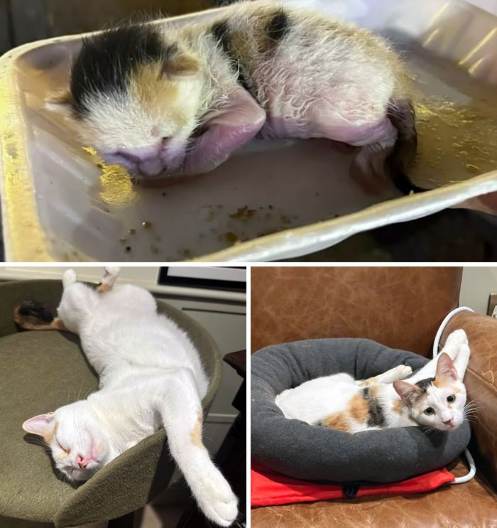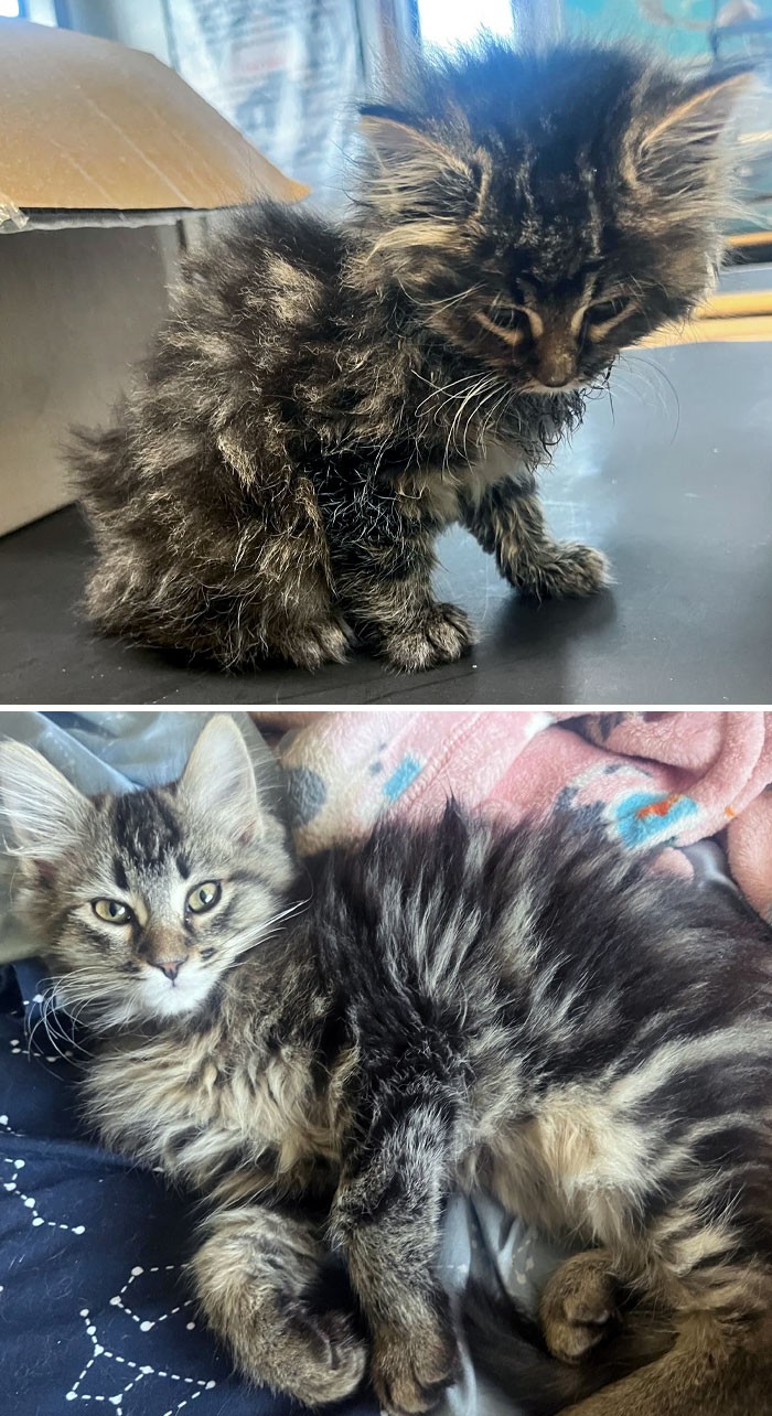 "Saya menemukan anak kucing ini dalam keadaan kedinginan dan terlihat sangat lesu. Dan saya tidak yakini apakah dia baik-baik saja. Untungnya kini dia ada pada akhir yang bahagia. Sebelum dan setelah diadopsi. Foto: Boredpanda