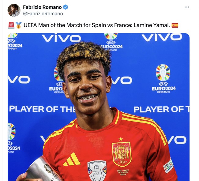 Lamine Yamal yang masih sangat muda menjadi Man of The Match laga semalam, di mana dia menyamakan kedudukan 1-1 setelah Spanyol sempat tertinggal. Foto: Twitter