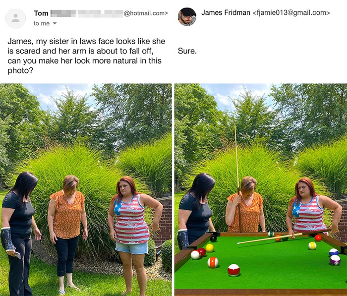 Minta editin foto pakai masker karena nikah saat pandemi. Foto: Instagram/James Fridman via Bored Panda