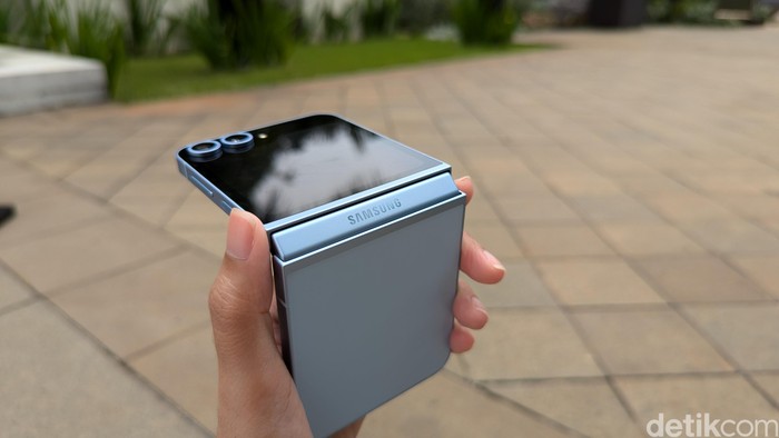 Ini Galaxy Z Flip 6 dalam pilihan warna Blue dengan nuansa pastel yang menggemaskan. Desainnya juga lebih flat, mengingatkan pada Galaxy S24 series. Foto: Virgina Maulita Putri/detikINET