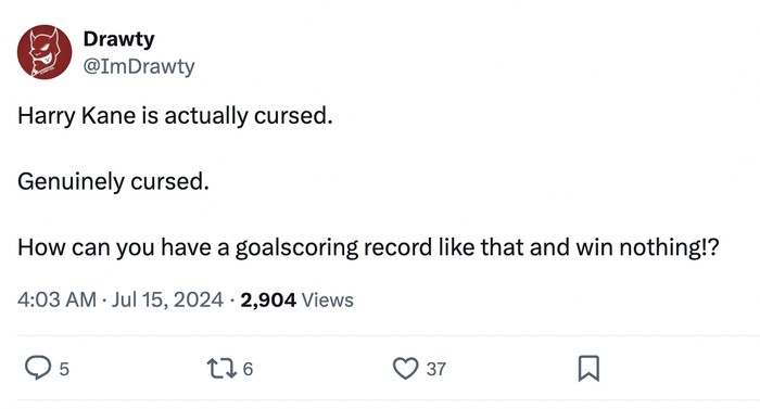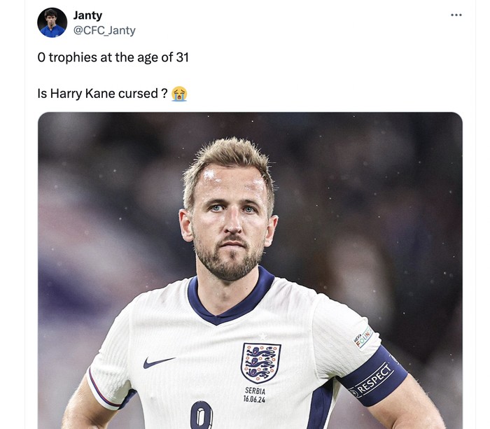 "Harry Kane dikutuk. Benar-benar dikutuk. Bagaimana mungkin dengan rekor gol seperti itu tapi tetap tidak menang apa-apa?" tulis akun ini. Foto: Twitter