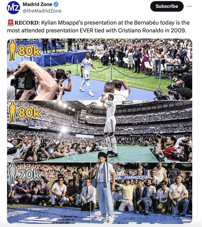 Gestur Mbappe saat perkenalan di Real Madrid disamakan dengan Cristiano Ronaldo dulu. Foto: Twitter