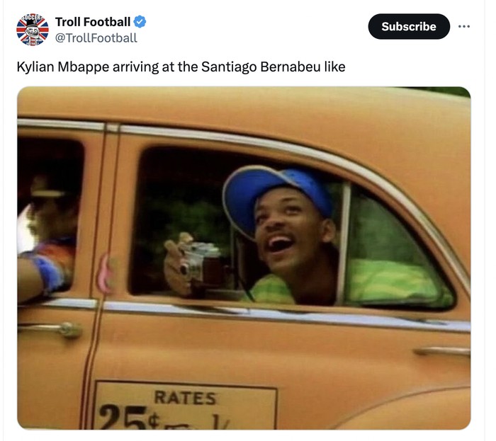 Meme Mbappe terkagum melihat Santiago Bernabeu. Foto: Twitter