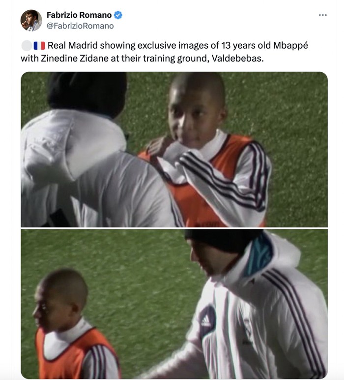 Real Madrid pun menayangkan foro eksklusif Mbappe yang berusia 13 tahun bersama Zinedine Zidane di lapangan latihan. Foto: Twitter