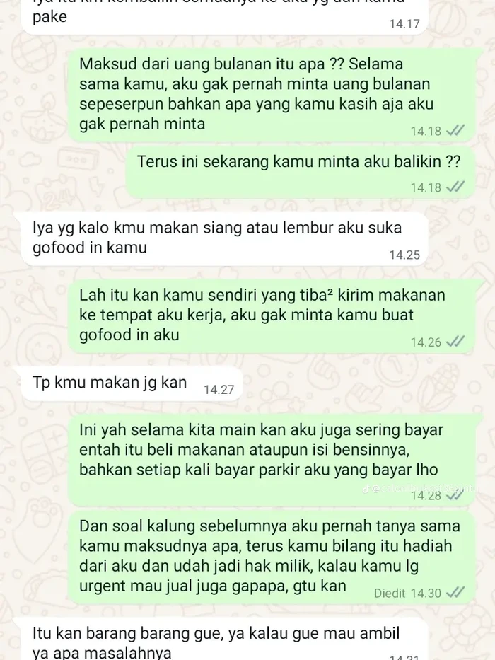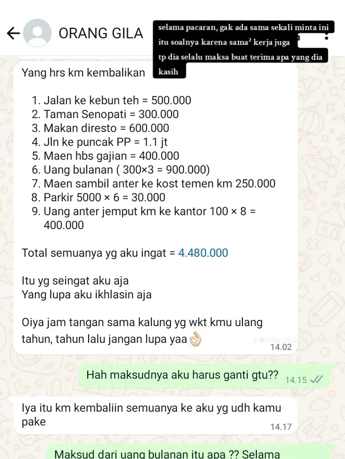 Awalnya, sang mantan pacar ngechat dengan rincian pengeluaran selama pacaran. Digetok deh nominal Rp 4.480.000. Buset, buset.Foto: TikTok/ibukost36pintu_