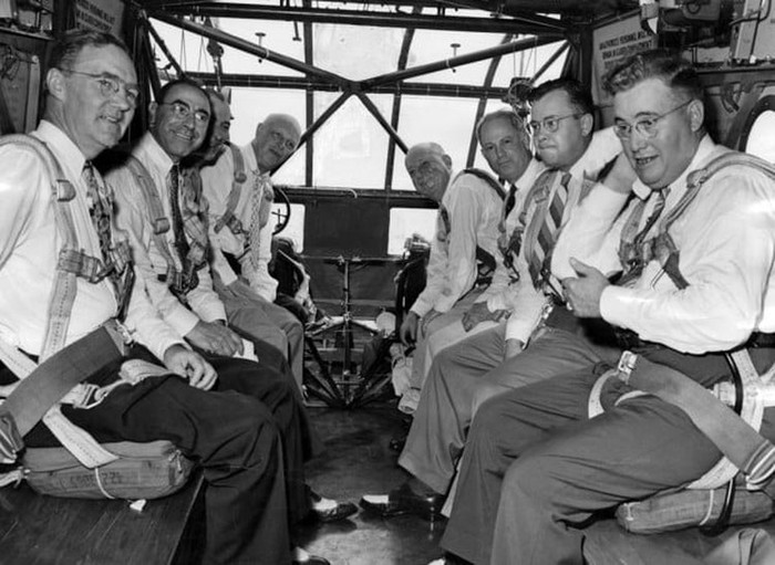 Pada tahun 1943, walikota St. Louis, William D Becker (di sebelah kiri), menaiki pesawat layang militer eksperimental untuk foto publisitas dan penerbangan singkat. Sayap kiri tiba-tiba lepas saat mereka mendekati ketinggian yang diinginkan, membuat pesawat layang itu menukik fatal. Kecelakaan itu merenggut nyawa semua orang di dalamnya. Foto: Brightside
