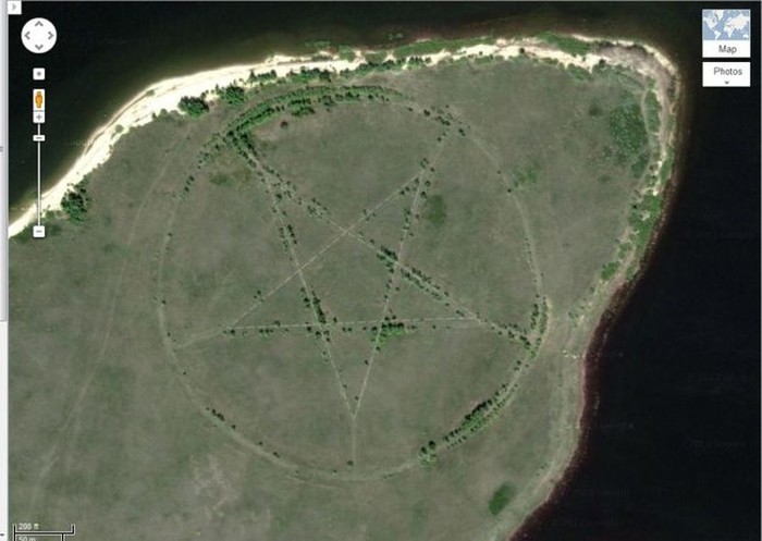 Sebuah pentagram dengan diameter 366 meter di pinggiran Kazakhstan adalah salah satu yang bikin heboh karena dikaitkan dengan penyembahan setan. Padahal, pentagram ini adalah garis besar taman yang dibuat dalam bentuk bintang. Foto: Google Earth