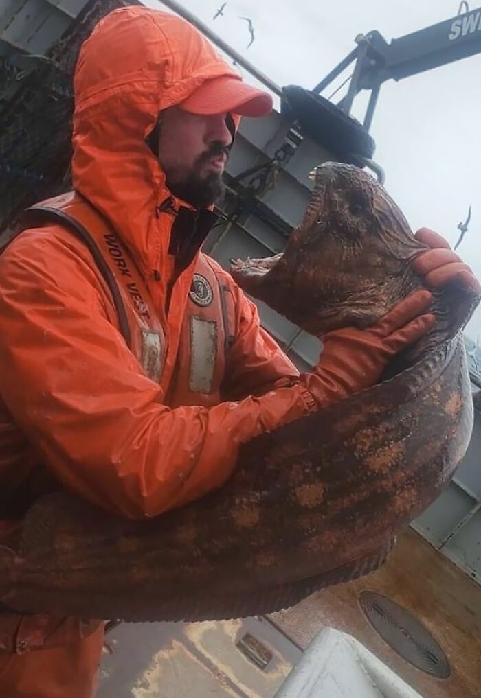 Nelayan vs belut serigala laut dalam. Foto: Reddit via Boredpanda