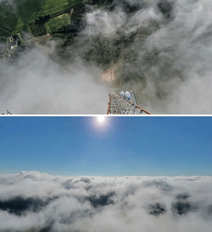 Gambar dari pekerja di Menara Radio setinggi 600 meter dari tanah. Ngeri lihat ke bawah, tapi pemandangan di atas luar biasa. Foto: Reddit via Boredpanda