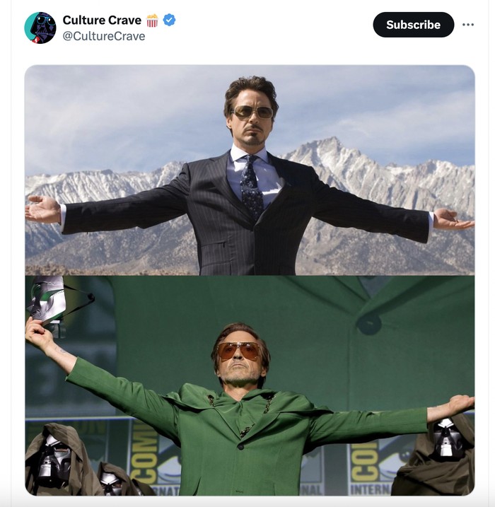 Robert Downey Jr dulu memerankan Iron Man tahun 2008, kini kembali sebagai Dr Doom. Foto: Twitter