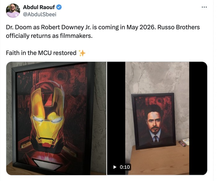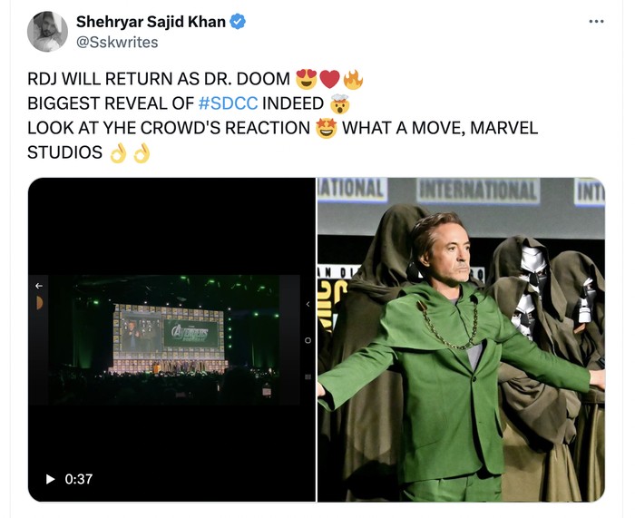 "Ini adalah pengumuman terbesar, RDJ kembali sebagai Dr Doom," sebut netizen ini yang memberikan dukungan. Foto: Twitter