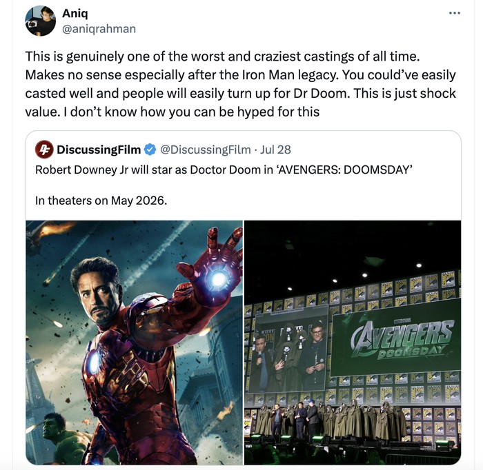 Tentu tak semua senang. "Ini benar-benar salah satu casting terburuk dan tergila sepanjang masa. Tidak masuk akal, terutama setelah warisan Iron Man. Anda bisa dengan mudah memilih (yang lain) dengan baik dan orang-orang akan dengan mudah mendukung Dr Doom. Saya tidak tahu bagaimana Anda bisa bersemangat untuk ini," tulis akun ini. Foto: Twitter