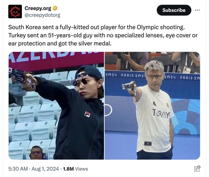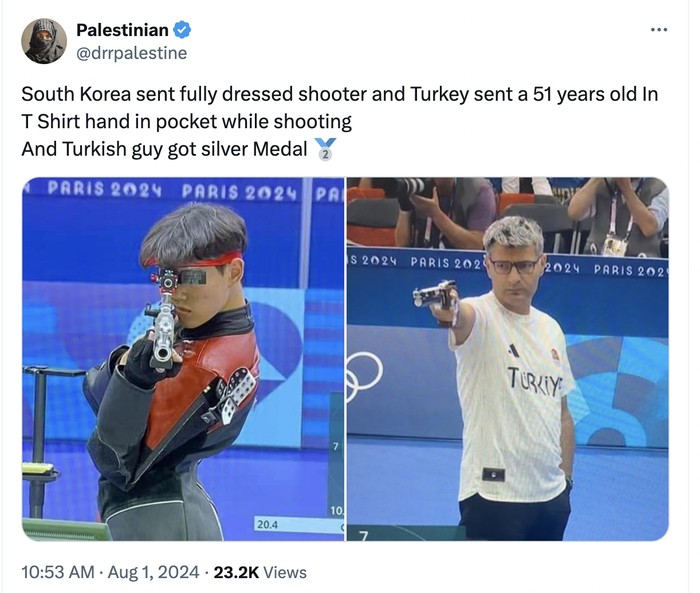 Korsel mengirimkan atlet yang berkostum lengkap sementara Turki mengirim pria usia 51 tahun tanpa lensa khusus, penutup mata dan pelindung telinga dan dia mendapatkan medali perak. Foto: X.com