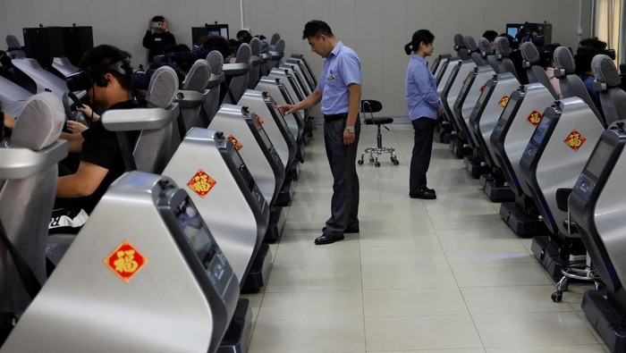 Seorang instruktur mengemudi memandu seorang siswa berlatih pada simulator mengemudi mobil realitas virtual (VR) di Eastern Pioneer Driving School di Beijing, China. Β