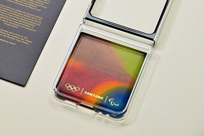 Galaxy Z Flip6 Edisi Olimpiade hadir dengan Casing Flipsuit eksklusif dan Kartu Flipsuit. Terbuat dari kulit mewah, Kartu Flipsuit menampilkan skema warna estetika yang terinspirasi oleh bendera Olimpiade untuk tekstur dan nuansa yang unik. Foto: Samsung