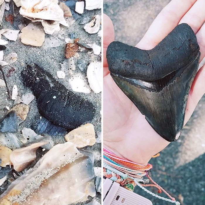 Menemukan fosil gigi megalodon saat berjalan di pantai. Megalodon adalah hiu terbesar dalam sejarah dan hidup ratusan juta tahun silam. Foto: Bored Panda