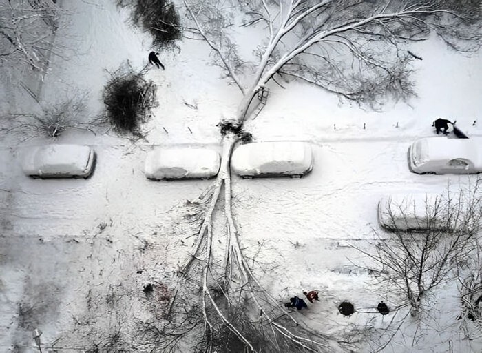 Dua mobil di Rusia sangat beruntung tidak terkena pohon besar yang jatuh saat badai salju. Foto: Bored Panda Β