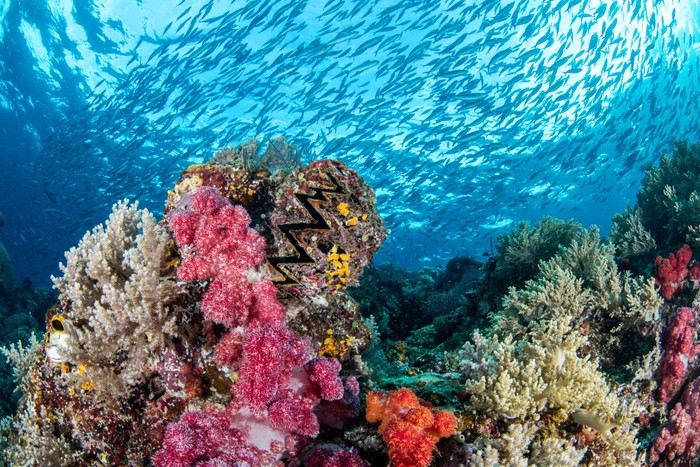 βPada sore itu, ada sejumlah ikan yang mencengangkan di perairan dangkal dengan fusilier, anthia, ikan kakap, ikan tentara, ikan spanduk, dan banyak lagi yang berenang bersama di sekolah masing-masing. Arus mengalir tinggi, jadi semua karang terbuka dan cahaya yang lembut dan memudar tepat untuk menangkap keindahan ekosistem yang sehat dalam aksi. Daerah Misool khususnya adalah contoh yang sangat baik dari pelestarian di tempat kerja. Upaya masyarakat setempat untuk melindungi laut belum pernah terjadi sebelumnya dan hasil kerja mereka dibuktikan dalam foto ini." Foto: Ocean Photographer Awards