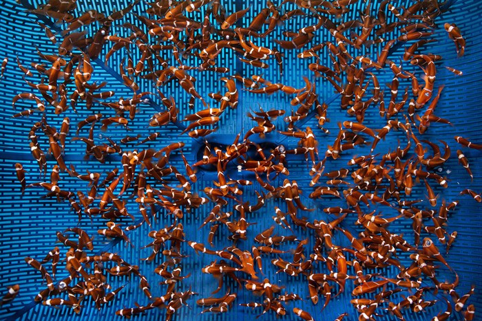 "Populasi menurun sebagai akibat dari penangkapan ikan yang berlebihan dan perdagangan ikan hias yang bergantung pada tangkapan liar. Untuk melawan gerakan ini, pemerintah telah membuat tempat penetasan pada tahun 2018 untuk menghidupkan kembali populasi ikan badut di alam liar." Β Foto: Ocean Photographer Awards
