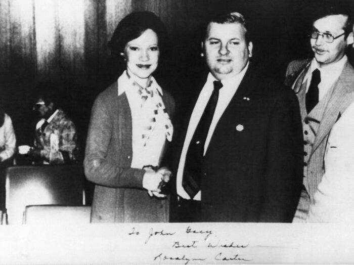Ini adalah gambar Ibu Negara Rosalynn Carter pada tahun 1978 berjabat tangan dengan pembunuh berantai John Wayne Gacy, yang aktif dalam politik pada saat itu Foto: dok Bored Panda