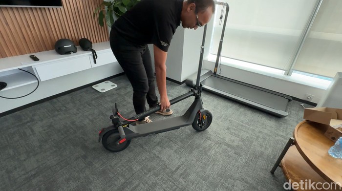 Skuter ini juga dapat dilipat dengan tiga langkah saja, sehingga pengguna tidak perlu khawatir akan ruang yang cukup ketika diperlukan saat dibawa bepergian. Foto: Adi Fida Rahman/detikINET