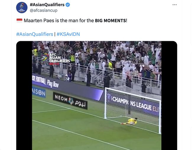 Penampilan Maarten Paes banyak dipuji, termasuk saat menggagalkan penalti Arab Saudi. Foto: Twitter/X