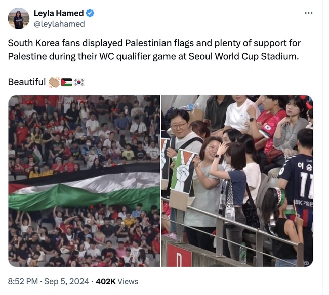 Fans Korea Selatan dipuji karena membentangkan bendera Palestina saat Timnas Korea Selatan berlaga melawan Palestina di Seoul. Foto: X.com